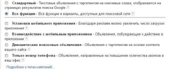 Когда вы выбрали настройку “Только поисковая сеть”, следующий шаг — выбрать между “Стандартный” и “Все функции.” В Google AdWords по умолчанию установлен “Стандартный” тип объявлений.